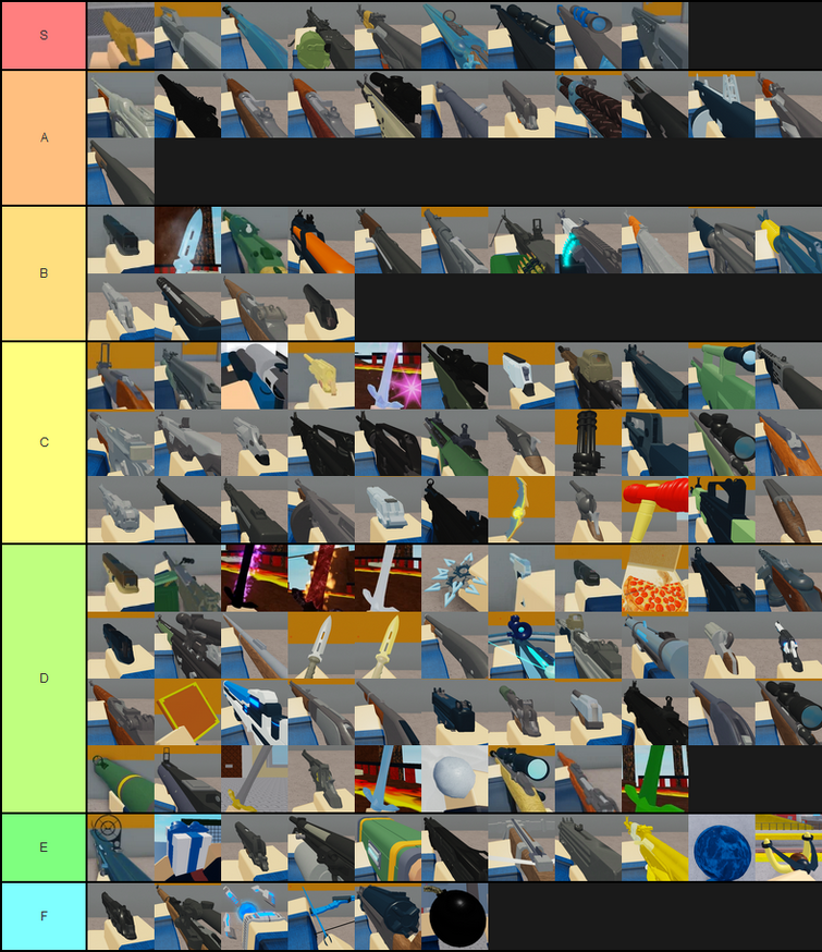I think that a lot of the projectile weapons are really crappy but some of them are more op than. Dec 24, 2019 · weapon tiermaker list. 8.34 rocket launcher that's good. I made a list on tiermaker with all the current weapons in arsenal (excluding removed weapons, exclusives, and some melees. Click 'save/download' and add a title and description. Arsenal skins tier list.(roblox arsenal)๐๐๐in this video i shared my opinion on arsenal skins! This list is both opinion and skill based but i just wanted to share with you guys, the reason some of these aren't expected is because they are skill based (coming from roblox that most people aren't that skilled/experienced). May 13, 2021 · 8.32 musket. Edit the label text in each row. This tier list will not play the same for everyone, and even other aggro players might find this not being accurate to their standards due to everyone being unique and playing differently. Which is the best arsenal skin to get? What do you use the knife for in arsenal? Talk (0) this category contains all melee weapons in arsenal.